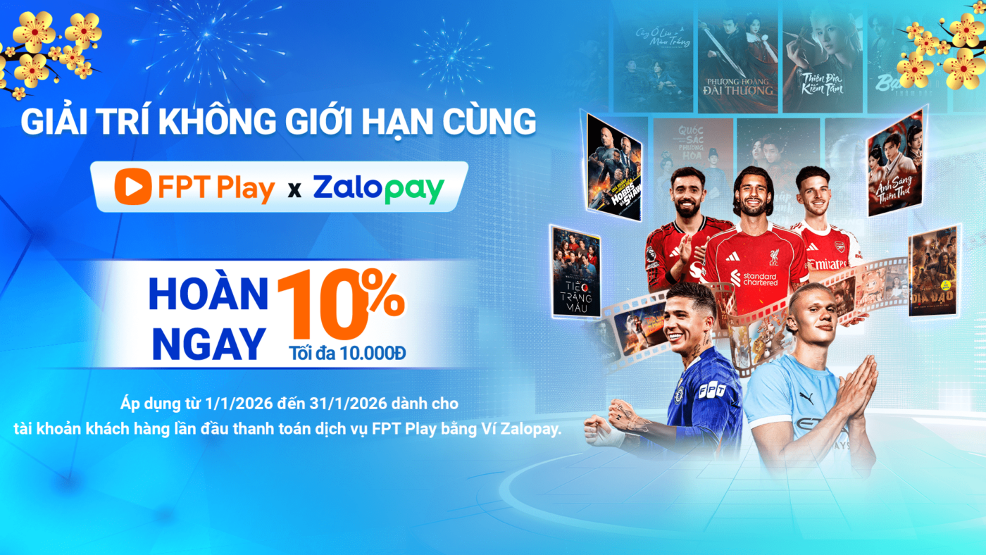 Từ ngày 01/1/2026 đến 31/1/2026, khi lần đầu thanh toán dịch vụ FPT Play bằng Ví Zalopay, bạn sẽ được hoàn ngay 10% giá trị giao dịch (tối đa 10.000 VNĐ). Chẳng cần đắn đo về giá, giờ đây bạn hoàn toàn có thể tự thưởng cho mình một không gian giải trí ‘xịn mịn’ mà vẫn đảm bảo tiêu chí vừa hay, vừa rẻ.